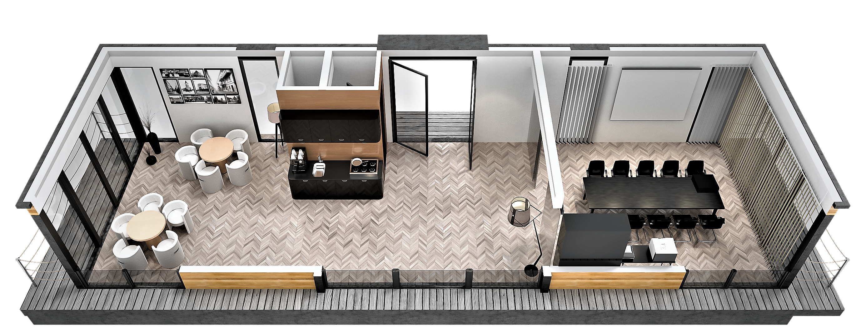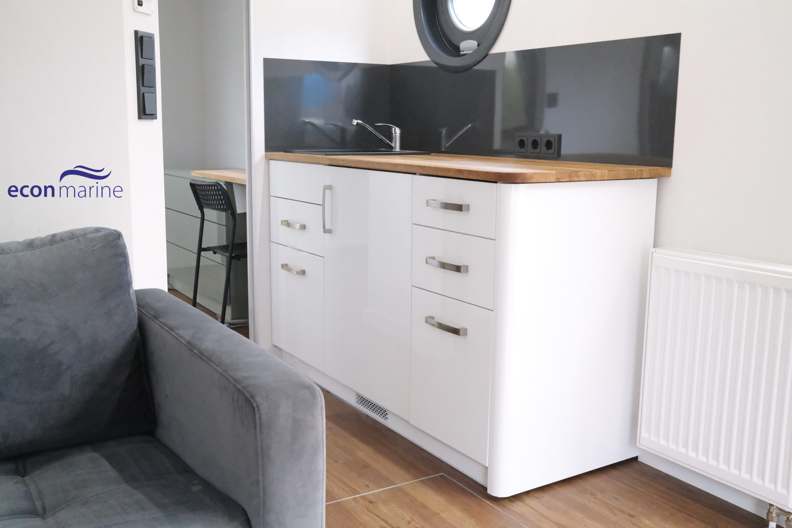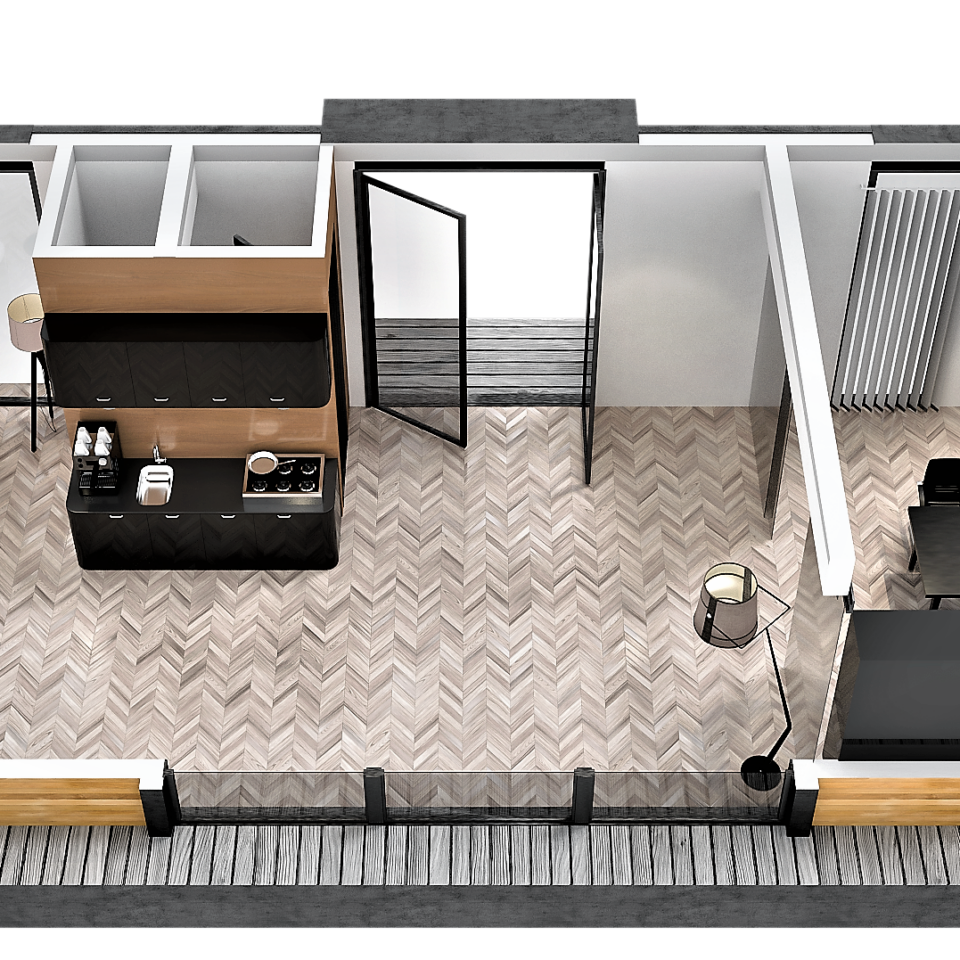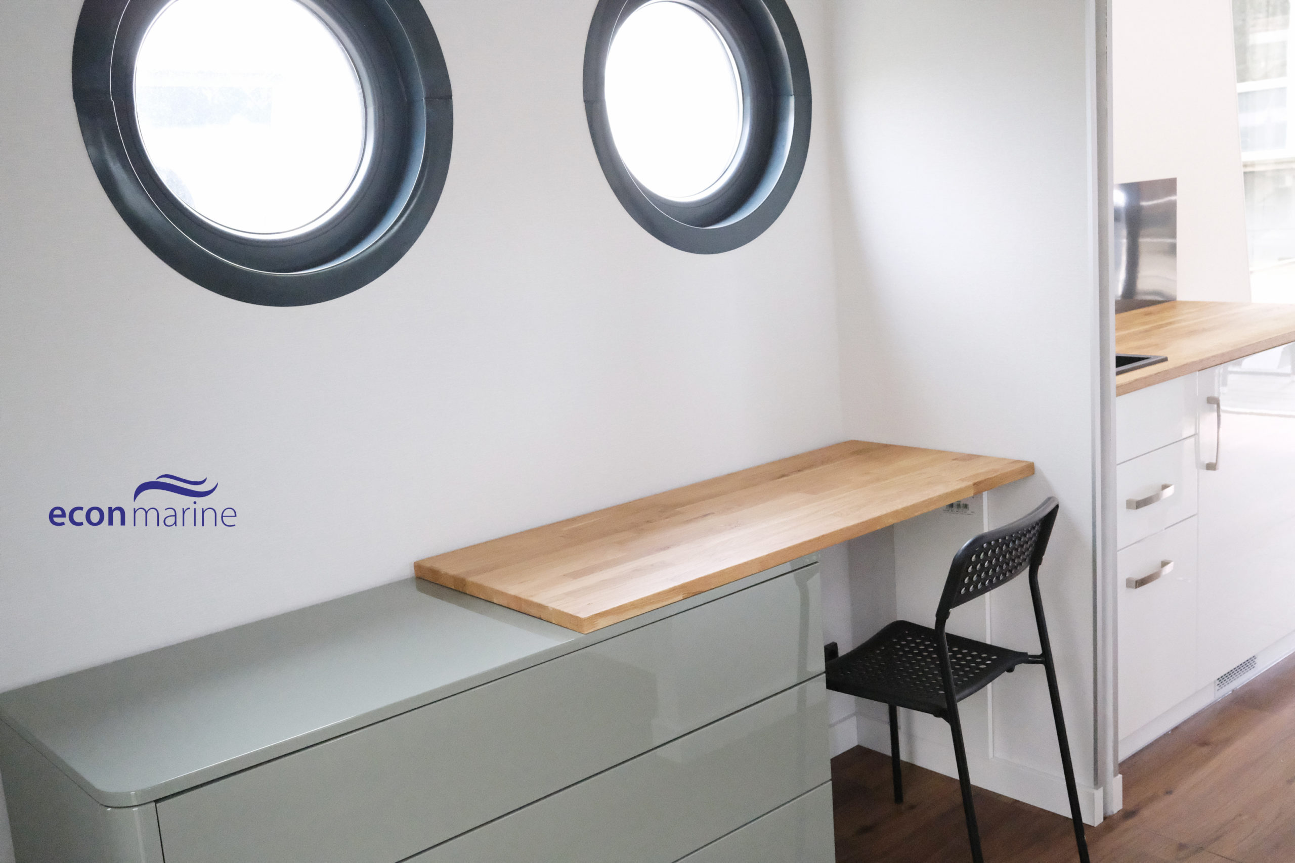 Wnętrze o powierzchni około 30 metrów kwadratowych obejmuje salon z kuchnią, sypialnię i przestronną łazienkę. Oprócz tarasu na dziobie, istnieje również możliwość wykorzystania tarasu dachowego, aby spędzić wieczór przy grillu lub poopalać się. Całe wnętrze wykonane jest w technologii CTS/konstrukcji drewnianej z najnowocześniejszą izolacją termiczną.