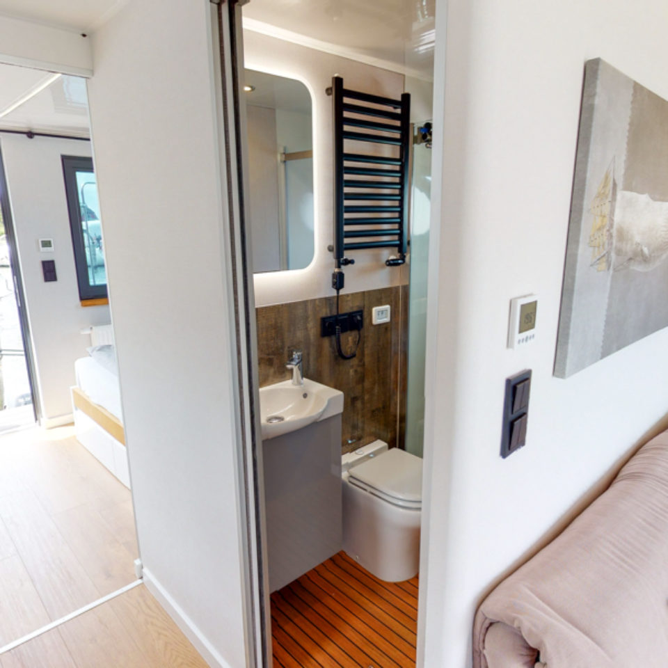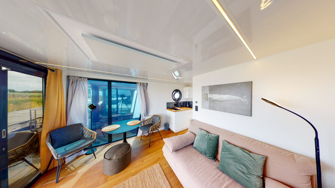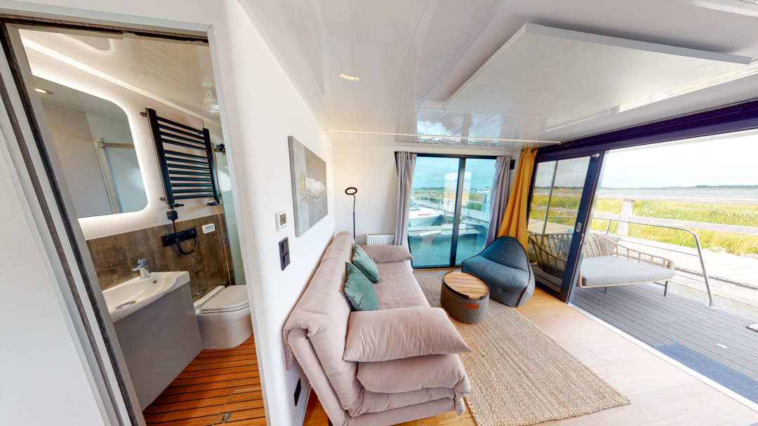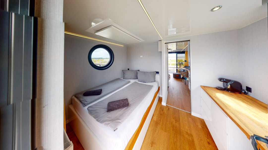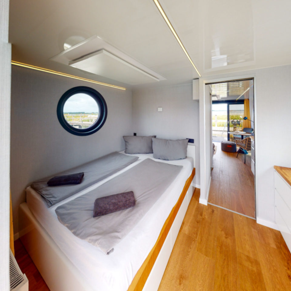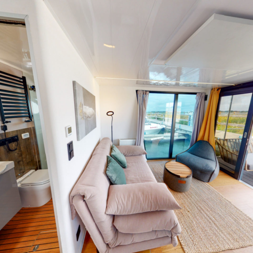 Przedstawiamy łódź mieszkalną RiverLoft 1000 – nowoczesną i elegancką, która wpasuje się w każde morskie otoczenie. Ten dwupokojowy pływający apartament oferuje idealne połączenie życia na wodzie i relaksujących wycieczek. Salon z aneksem kuchennym pozwala poczuć się jak w domu, bez względu na pogodę. Oczywiście, łazienka i część sypialna zapewniają komfort znany z domków na wodzie Econ Marine.