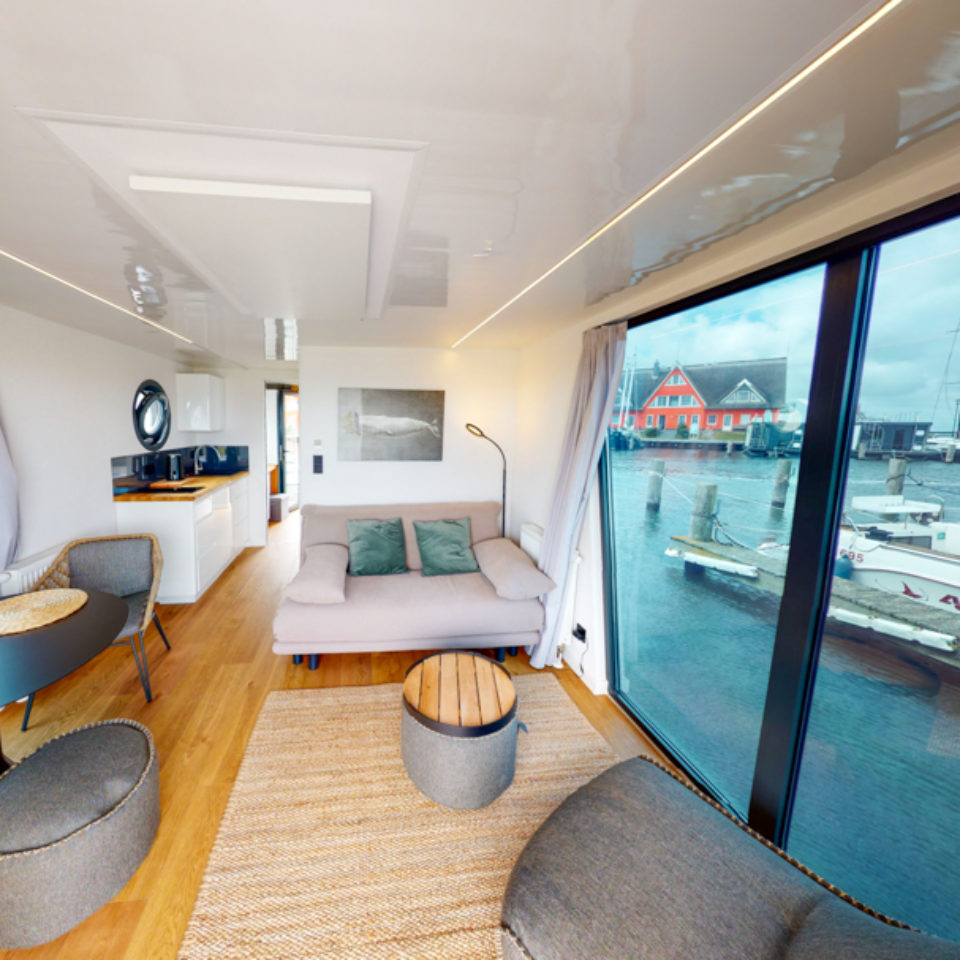 Powierzchnia wewnętrzna wynosząca około 50 metrów kwadratowych oferuje miejsce na salon, sypialnię, kuchnię oraz kompletną łazienkę z prysznicem i toaletą. Wypełniony światłem salon z dużymi przesuwanymi drzwiami i swobodnie zaprojektowana kuchnia nie pozostawiają nic do życzenia. Zintegrowane schody na platformie prowadzą na taras na dachu o powierzchni 15 metrów kwadratowych.
