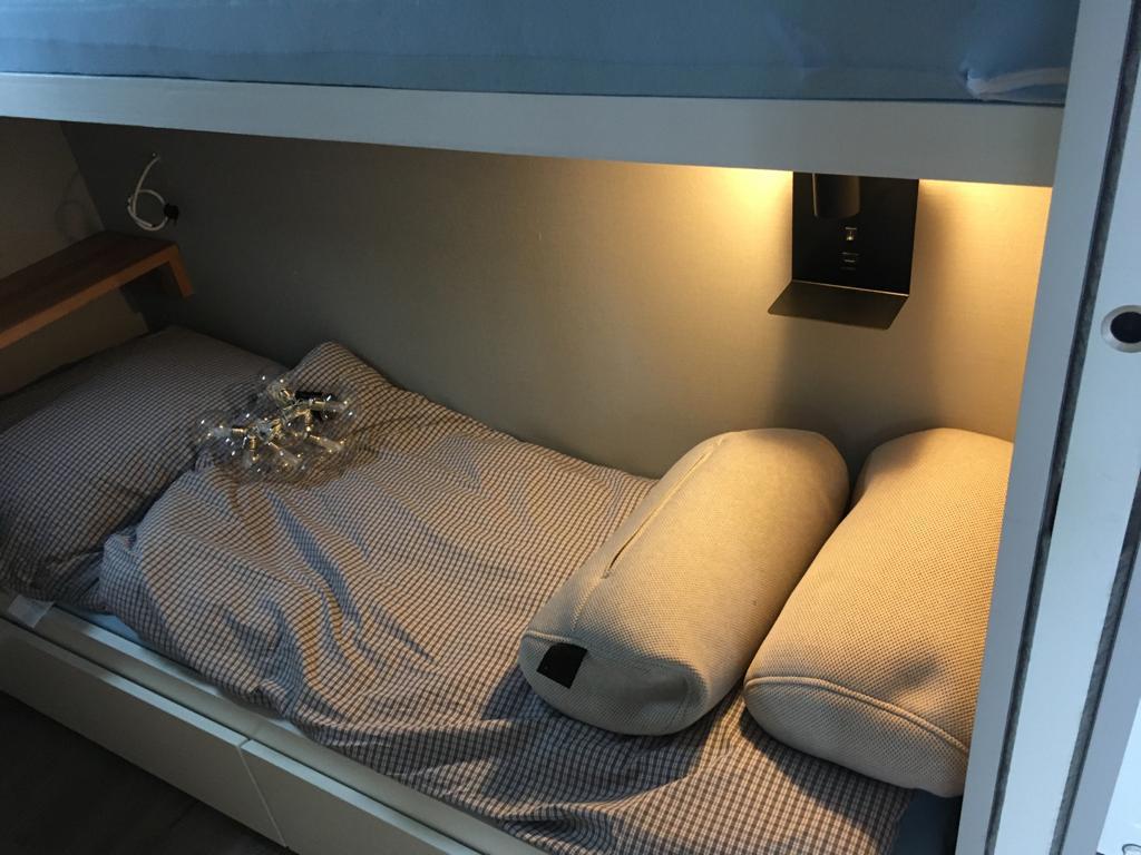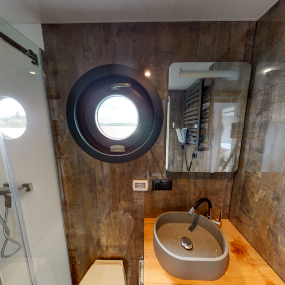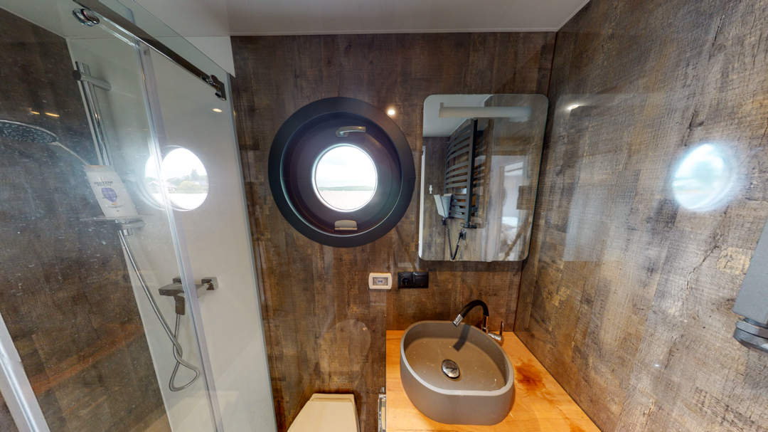 Łazienka wyposażona jest w toaletę, umywalkę z lustrem, prysznic, kosze na śmieci i wieszaki na ubrania, bojler do podgrzewania wody oraz „duży iluminator” z żaluzją.