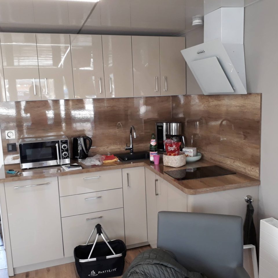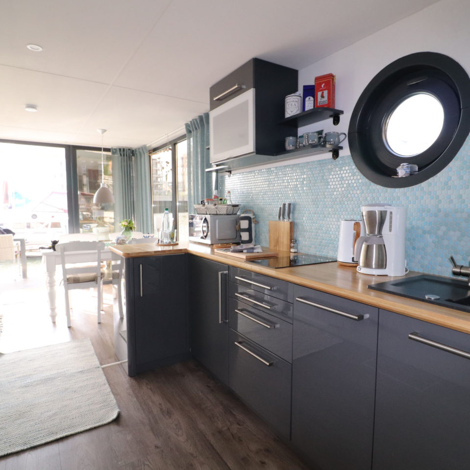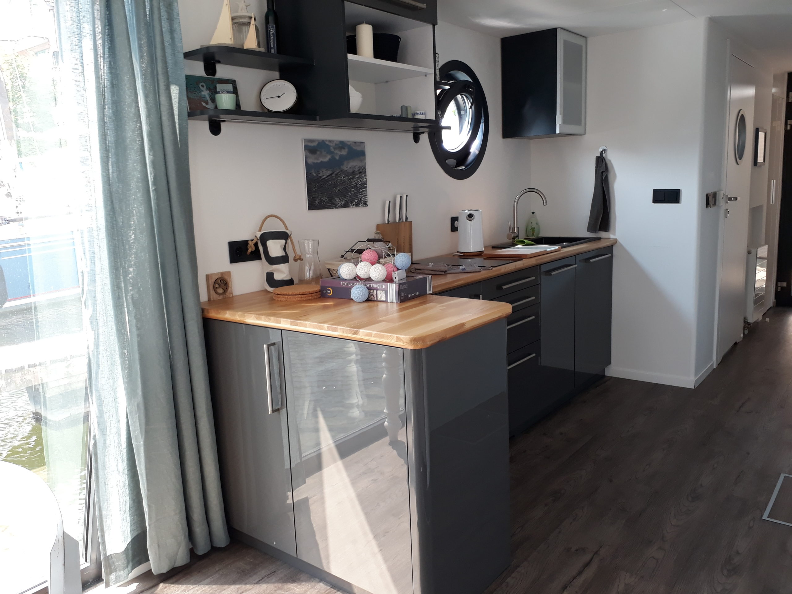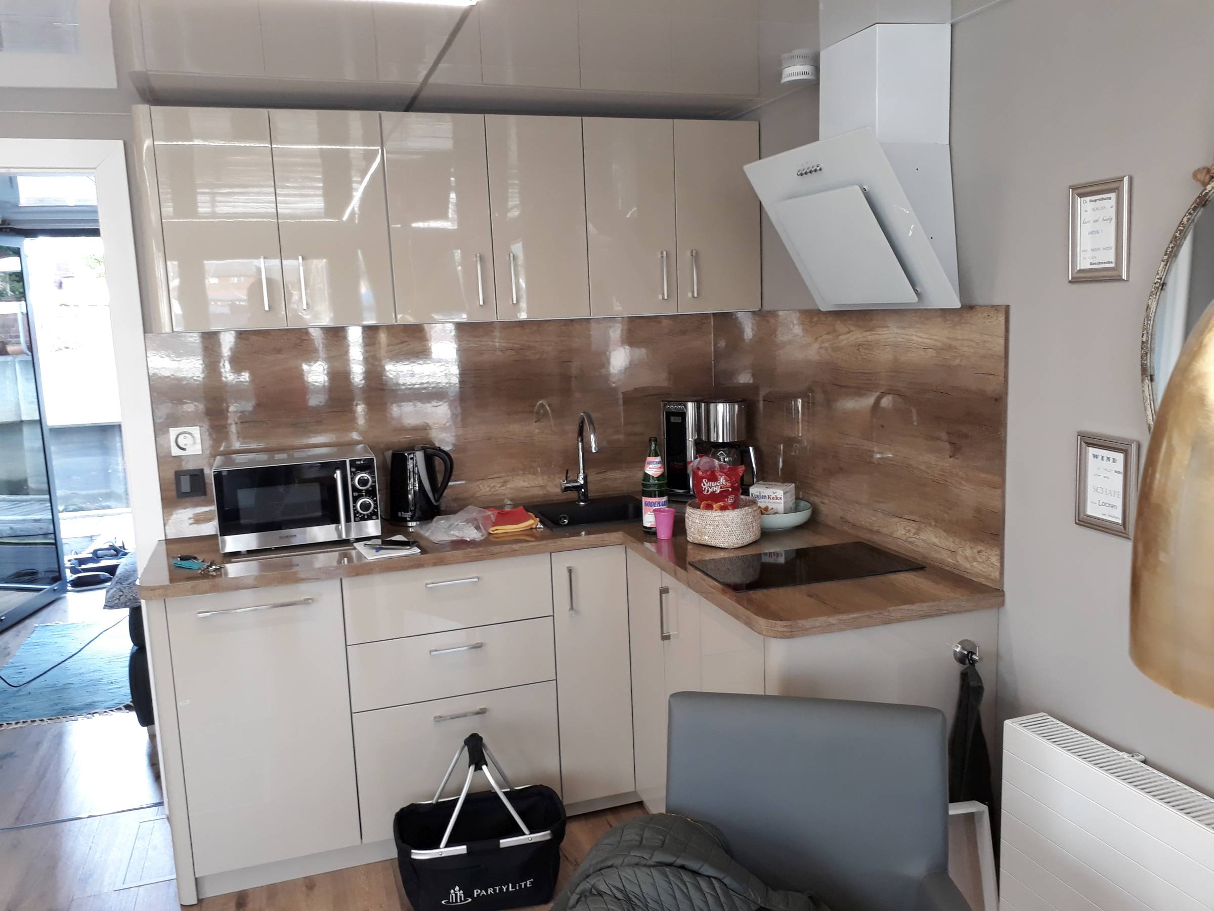 Otwarta spiżarnia jest wyposażona w szafkę kuchenną ze zlewem, 5-litrowy podgrzewacz wody 230 V AC, standardową lodówkę podblatową 230 V AC oraz szafki ścienne.