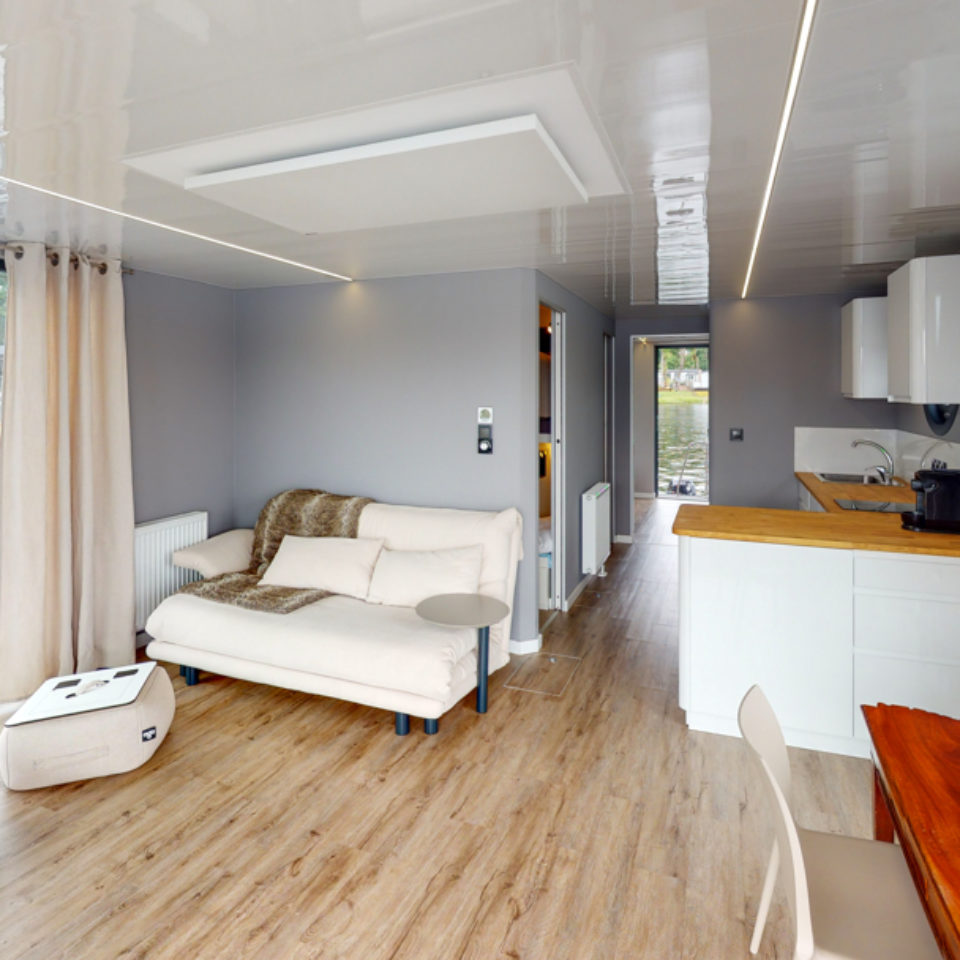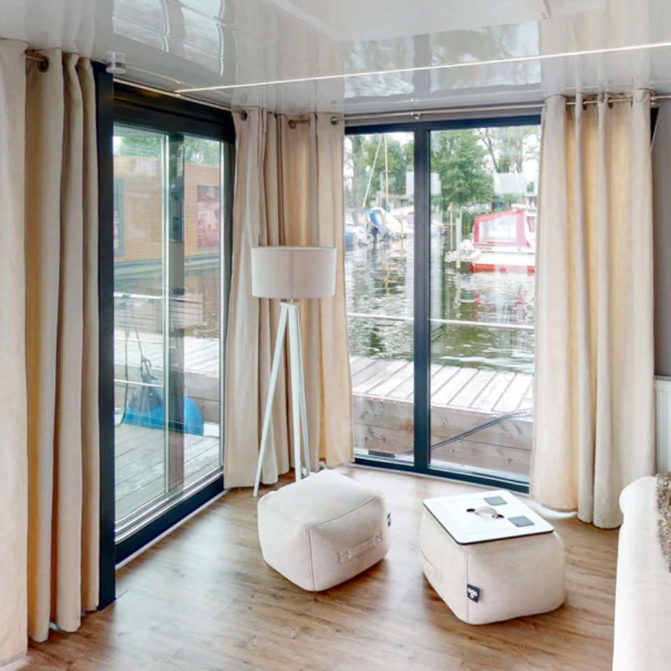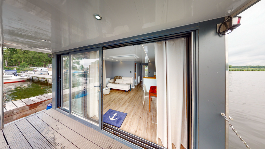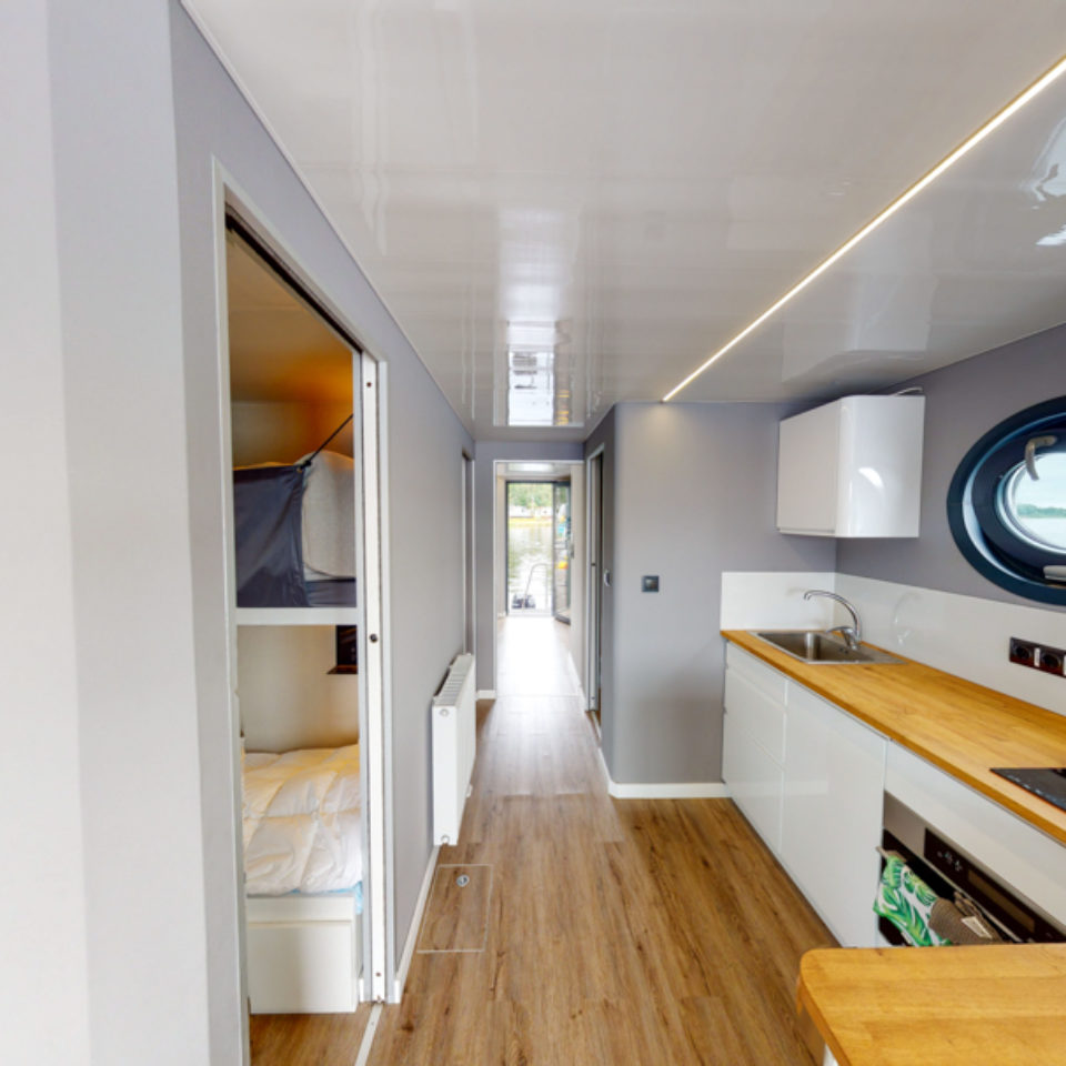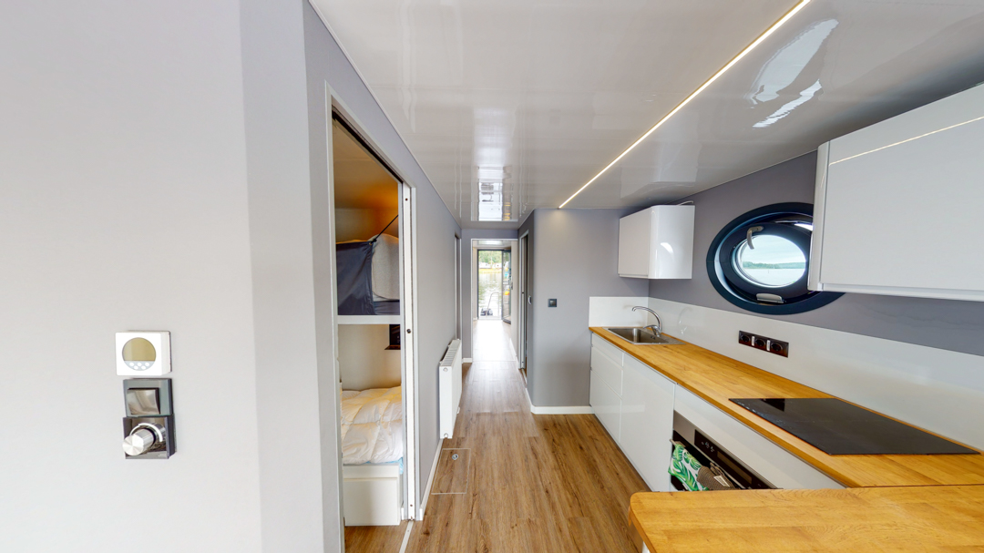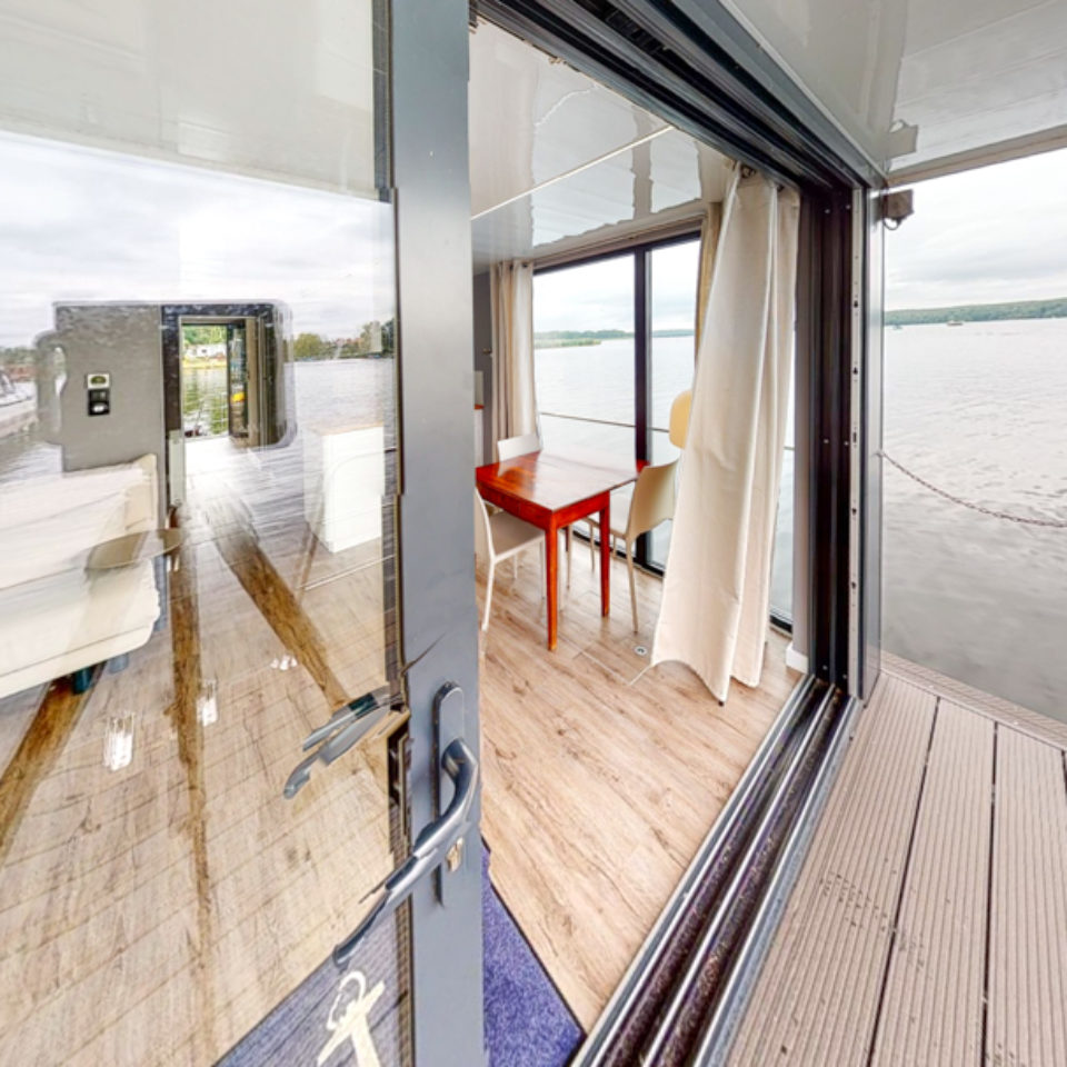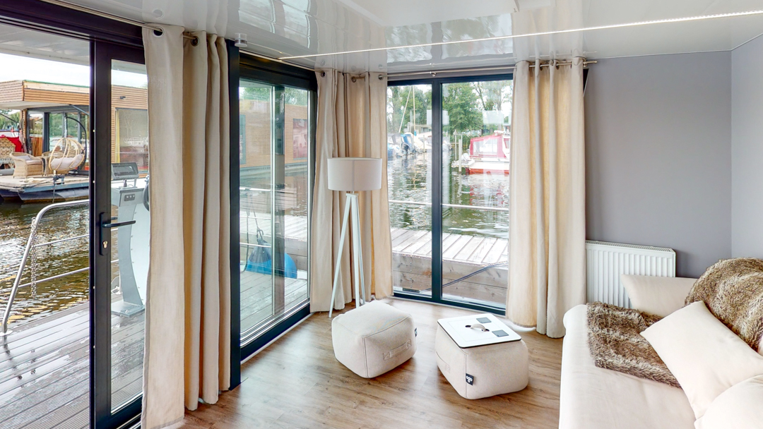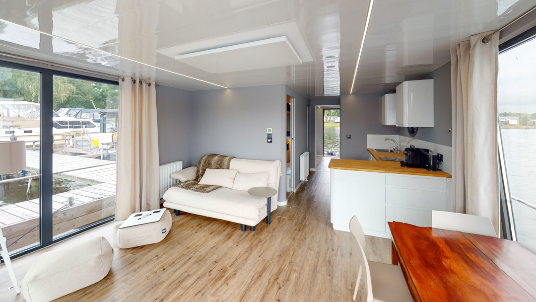 Adaptacja wnętrza domu na wodzie (powierzchnia netto ok. 30 m²) z salonem, sypialnią i pokojem dziecięcym jest zawsze projektem indywidualnym, który jest umeblowany i wyposażony według życzeń klienta. Proponujemy projekty wnętrz.